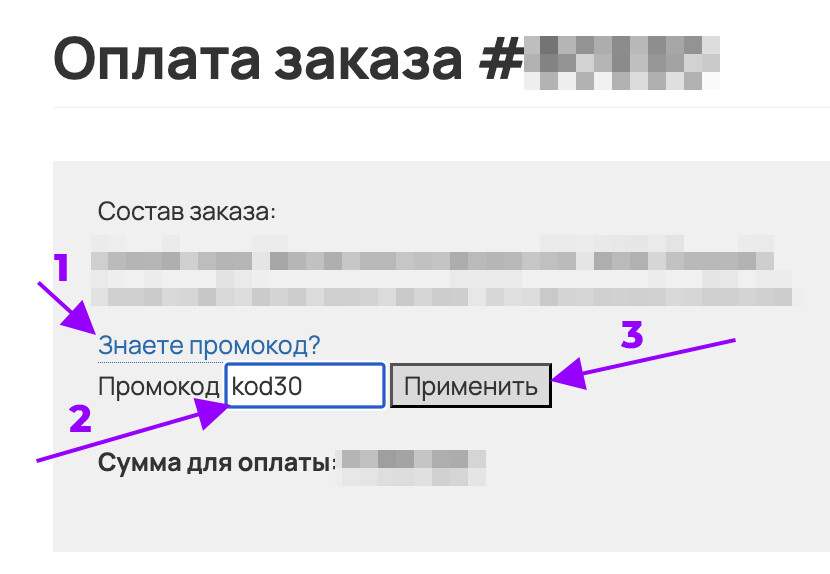 Промокод нужно ввести на странице оплаты в поле "Знаете промокод?"